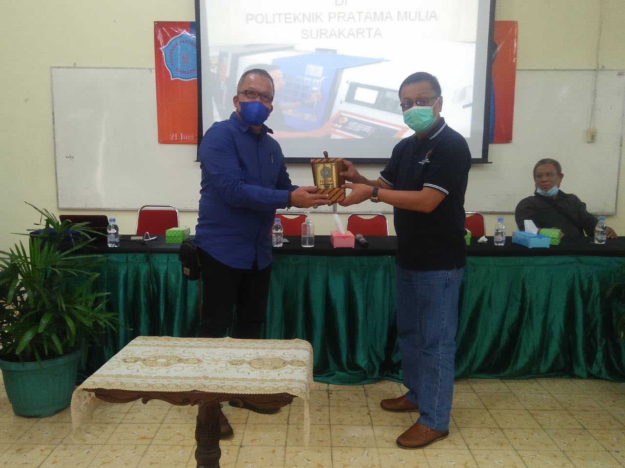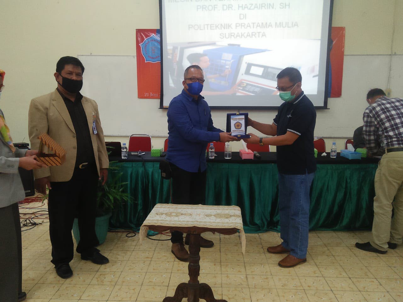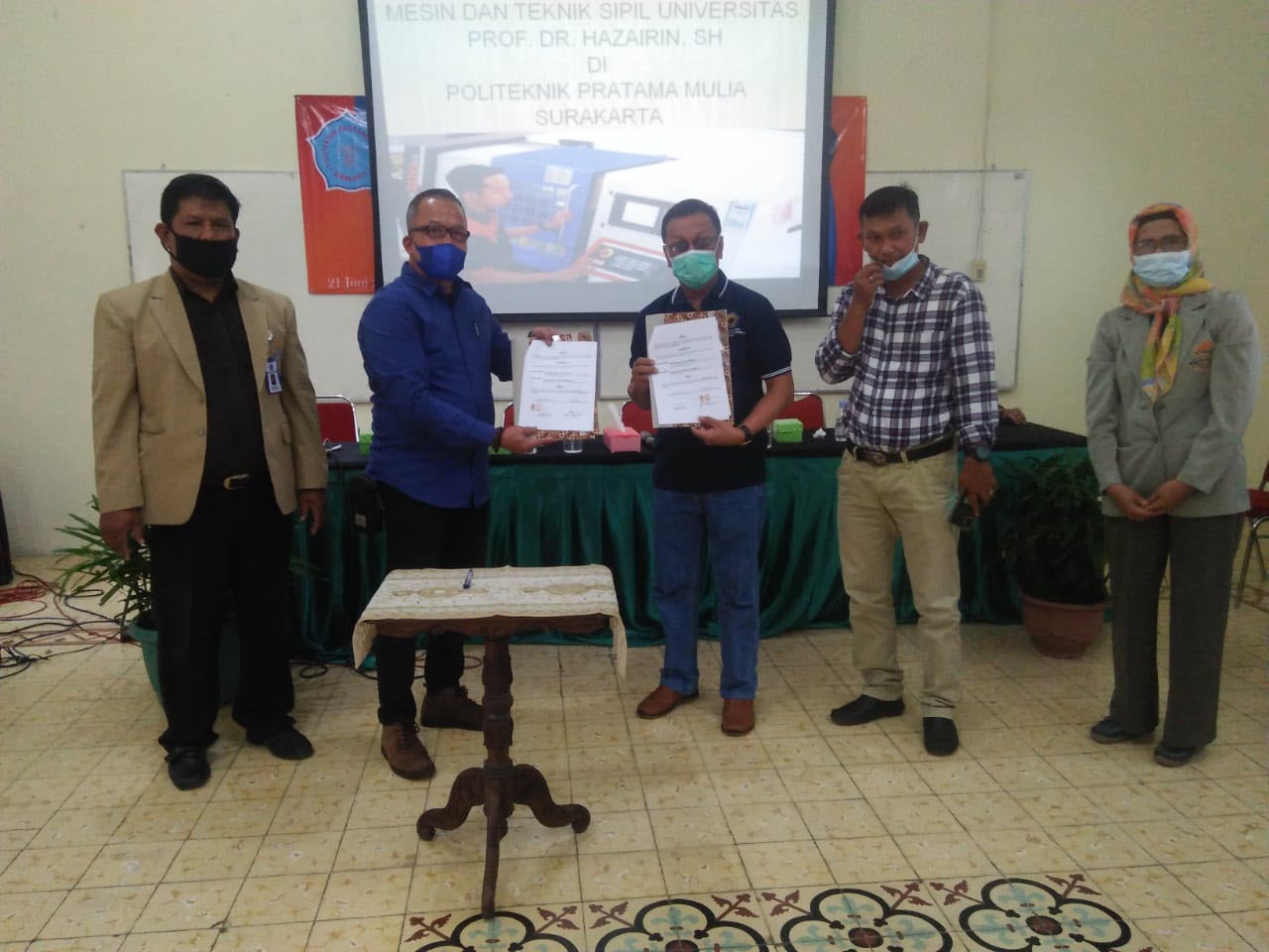 Setelah penandatanganan MOU, acara dilanjutkan dengan serah terima cinderamata dari kedua belah pihak Politama Surakarta dengan Jurusan Teknik Mesin dan Teknik Sipil Universitas Prof. Dr. Hazairin, SH Bengkulu. Pada kesempatan ini rombongan dari Jurusan Teknik Mesin dan Teknik Sipil Universitas Prof. Dr. Hazairin Bengkulu melakukan kunjungan laboratorium yang berada di kampus Politama Surakarta.