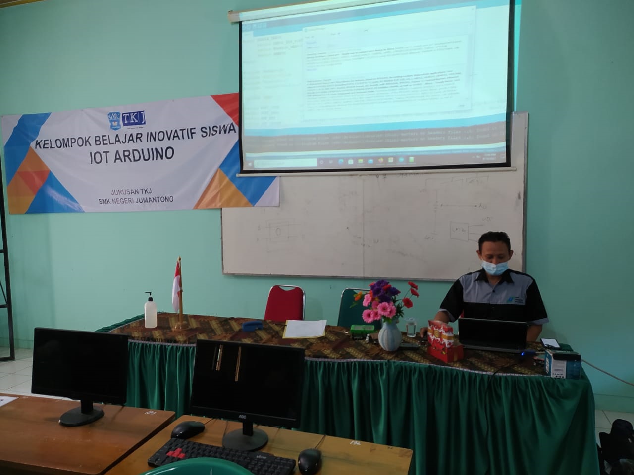 Dalam kegiatan diklat hari ke-2 yang dilaksanakan hari Kamis, 10 Juni 2021, bertempat di Lab 1 Jurusan Teknik Komputer dan Jaringan, SMK Negeri Jumantono, dosen dan mahasiswa Teknik Elektronika memberikan materi yang lebih mendalam, yaitu mengenai implementasi IoT dalam penerapan yang paling sederhana sampai dengan penerapan yang lebih kompleks.