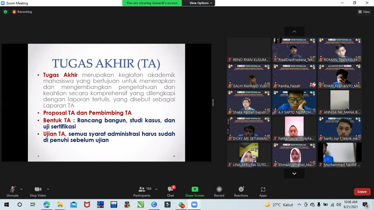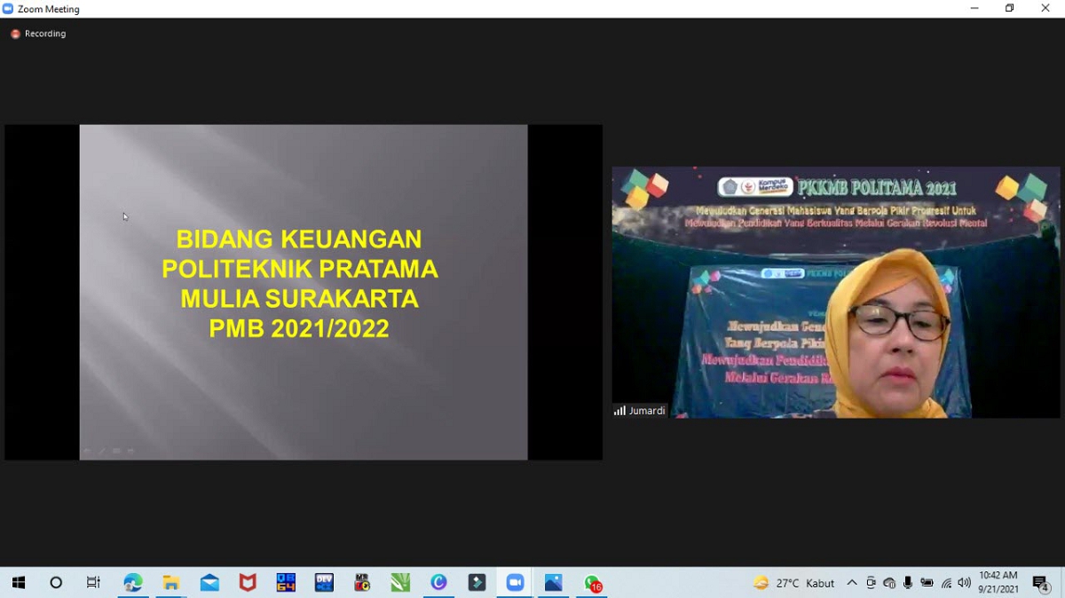 Pembukaan PKKMB (Pengenalan Kehidupan Kampus Mahasiswa Baru ) Tahun Akademik 2021/2022 Politeknik Pratama Mulia Surakarta pada hari Selasa 21/09/2021 secara daring dengan Zoom Meeting dengan dibuka oleh Wakil Direktur Bp. Didik Purwadi, SH., M.Hum. dan dilanjutkan pengisi materi :